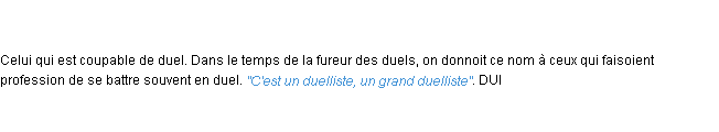 Ancienne signification développée en 1798 par l’académie Française (ACAD - 1798).Merci à Nadine et Claire pour la numérisation du mot duelliste.