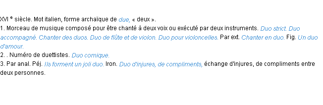 Définition de « duo » de source académique (Académie Française, parution de 1986).