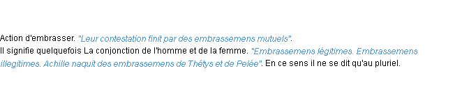 Ancienne signification éditée par l’Académie Française, année 1798.Merci à Léon et Mathilde pour la numérisation du mot embrassement.