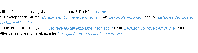 Signification du terme « embrumer », parution de 1876 (dictionnaire le Littré).Merci à Mignon et Chloé pour la numérisation du mot embrumer.