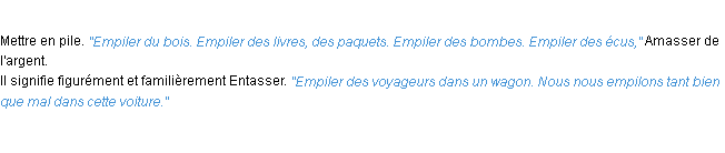 Ancienne signification parue en 1798 dans dictionnaire de l’Académie Française.Merci à Sylvianne et Firmin pour la numérisation du mot empiler.