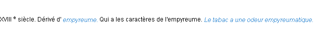 Ancienne signification développée en 1798 par l’académie Française (ACAD - 1798).Merci à Bastien et Benoite pour la numérisation du mot empyreumatique.
