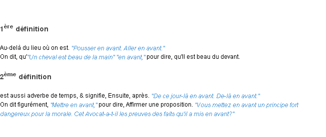 Ancienne signification éditée en 1798 pour le terme « en avant » par l’Académie Française.