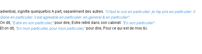 Ancienne signification éditée en 17962 pour le terme « en particulier » par l’Académie Française.