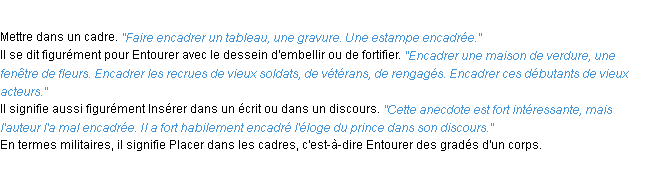 Ancienne signification éditée en 1798 pour le terme « encadrer » par l’Académie Française.