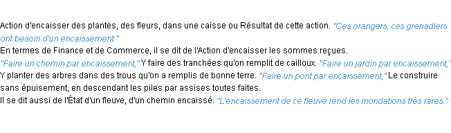 Ancienne signification issue du dico de l’Académie Française, parue en 1798.Merci à Pascal et Renaud pour la numérisation du mot encaissement.