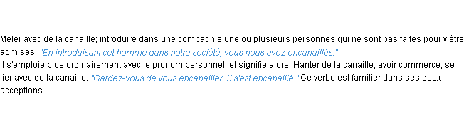 Ancienne signification éditée en 1798 pour le terme « encanailler » par l’Académie Française.Merci à Josiane et Pascaline pour la numérisation du mot encanailler.