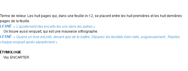 Définition du mot « encart » par Emile Littré (édition de 1876).Merci à Thierry et Margot pour la numérisation du mot encart.