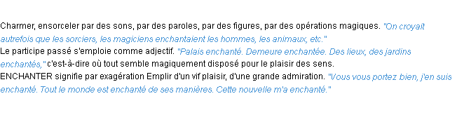 Ancienne signification développée en 1798 par l’académie Française (ACAD - 1798).Merci à Hervé et Dominique pour la numérisation du mot enchanter.