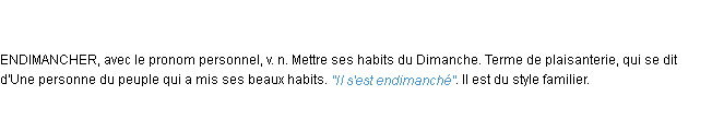 Ancienne signification développée en 1798 par l’académie Française (ACAD - 1798).Merci à Juliette et Michèle pour la numérisation du mot endimancher.