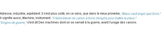 Ancienne signification développée en 1798 par l’académie Française (ACAD - 1798).Merci à Olivie et Céline pour la numérisation du mot engin.