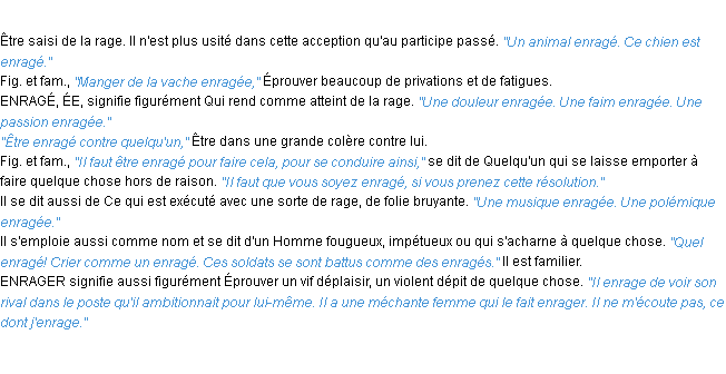 Ancienne définition développée dans dictionnaire académique, 1798.Merci à Eloi et Sacha pour la numérisation du mot enrager.