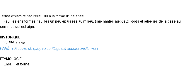 Signification éditée en 1876 pour le terme « ensiforme » par Emile Littré.Merci à Théodore et Perceval pour la numérisation du mot ensiforme.