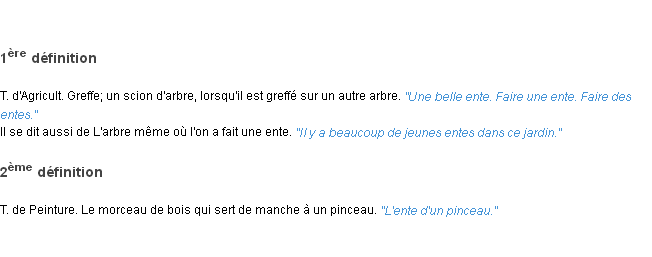 Ancienne signification parue en 1798 dans dictionnaire de l’Académie Française.Merci à Adèle et Christophe pour la numérisation du mot ente.