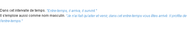 Signification éditée en 1876 pour le terme « entre-temps » par Emile Littré.Merci à Honoré et Dominique pour la numérisation du mot entre-temps.