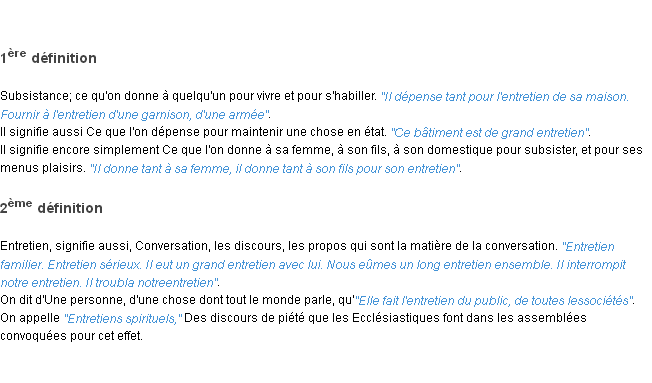 Ancienne définition de « entretien » de source académique (Académie Française, parution de 1835).