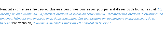 Signification parue en 2009 (source la-definition.fr).Merci à Maximilien et Tatienne pour la numérisation du mot entrevue.
