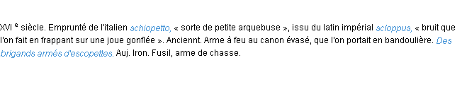 Ancienne signification développée en 1798 par l’académie Française (ACAD - 1798).Merci à Cyrille et Guillaume pour la numérisation du mot escopette.