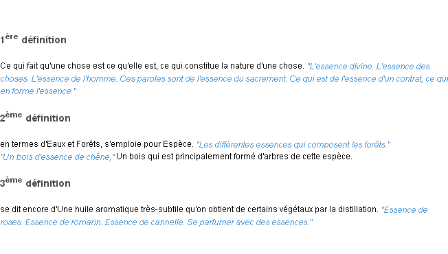 Ancienne définition académique pour le terme « essence » (parue en 1798).Merci à Jean-marie et Théodore pour la numérisation du mot essence.