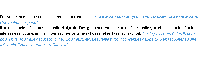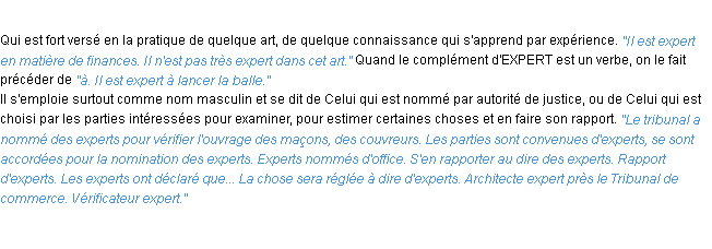 Ancienne signification parue en 1798 dans dictionnaire de l’Académie Française.Merci à Florette et Nadine pour la numérisation du mot expert.