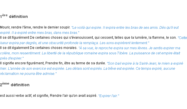 Signification du terme « expirer », parution de 1986, dictionnaire académique Français.