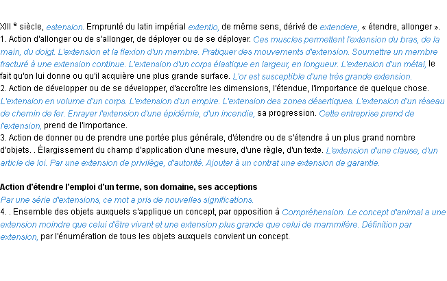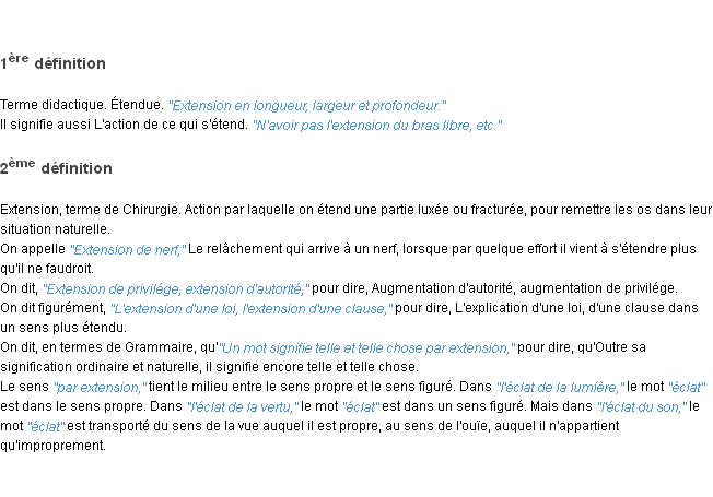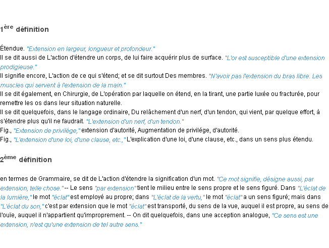Ancienne signification éditée en 1835 pour le terme « extension » par l’Académie Française.