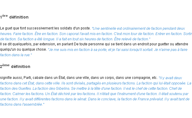 Signification du terme « faction », parution de 1932, dictionnaire académique Français.