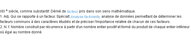 Signification éditée par l’Académie Française, année 1986.Merci à Lucille et Marguerite pour la numérisation du mot factoriel.