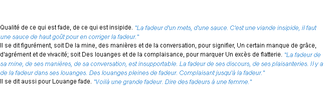 Ancienne signification issue du dico de l’Académie Française, parue en 1798.Merci à Nicolas et Odile pour la numérisation du mot fadeur.