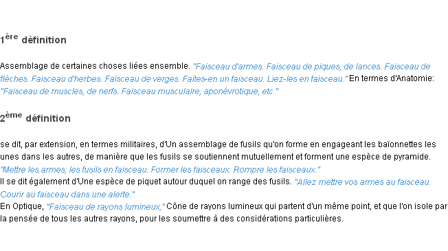 Ancienne signification éditée par l’Académie Française, année 1798.Merci à Christelle et Laure pour la numérisation du mot faisceau.