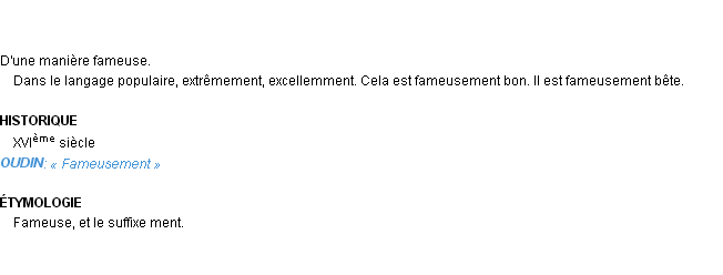 Définition « fameusement » du dictionnaire académique Français, parution de l’année 1986.