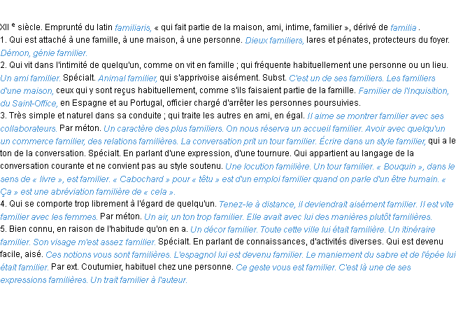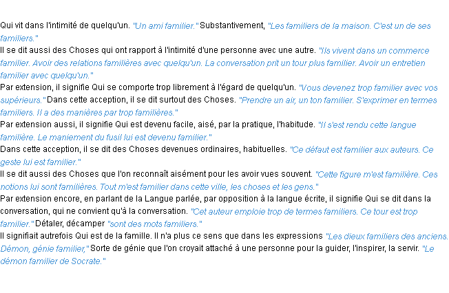 Ancienne signification éditée par l’Académie Française, année 1798.Merci à Désiré et Geneviève pour la numérisation du mot familier.