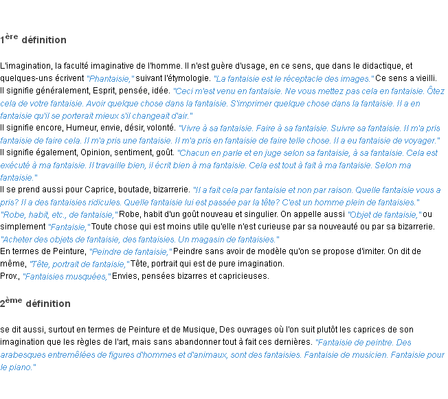 Ancienne signification du terme « fantaisie », parution de 1798, dictionnaire académique Français.Merci à Clément et Olivier pour la numérisation du mot fantaisie.