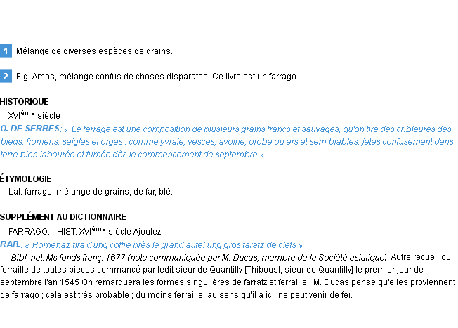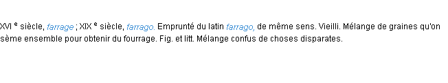 Définition développée dans dictionnaire d’Emile Littré (ancienne édition de 1876).Merci à Matthieu et Aurèle pour la numérisation du mot farrago.