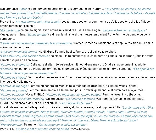 Ancienne définition de l’Académie Française (édition de 1798) pour le mot « femme ».Merci à Jacques et édith pour la numérisation du mot femme.