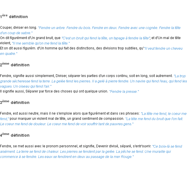 Ancienne signification parue en 1798 dans dictionnaire de l’Académie Française.Merci à Jolie et Aurelien pour la numérisation du mot fendre.