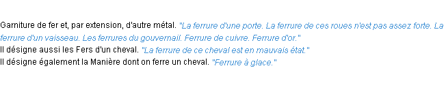Ancienne signification développée en 1798 par l’académie Française (ACAD - 1798).Merci à Gilberte et Sidonie pour la numérisation du mot ferrure.