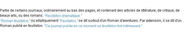 Signification éditée en 2010 par l’équipe de la-definition.fr.Merci à émile et Armelle pour la numérisation du mot feuilleton.