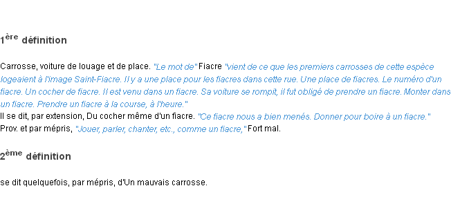 Ancienne signification développée en 1798 par l’académie Française (ACAD - 1798).Merci à Sidonie et Lunete pour la numérisation du mot fiacre.