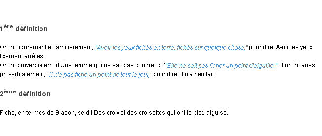 Ancienne signification du terme « fiche », parution de 1835, dictionnaire académique Français.