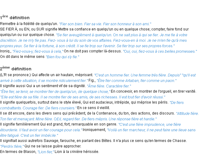 Définition de l’Académie Française (édition de 1986) pour le mot « fier ».