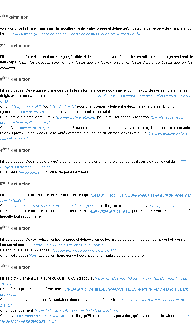 Ancienne signification développée en 17962 par l’académie Française (ACAD - 17962).Merci à Mignon et Emeline pour la numérisation du mot fil.