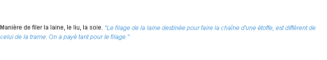Ancienne signification développée en 1798 par l’académie Française (ACAD - 1798).Merci à Nadine et Jacques pour la numérisation du mot filage.