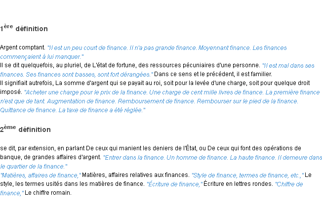 Ancienne signification développée en 1798 par l’académie Française (ACAD - 1798).Merci à Chloé et Cosette pour la numérisation du mot finance.