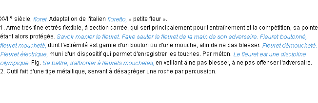 Ancienne définition de « fleuret » de source académique (Académie Française, parution de 1835).