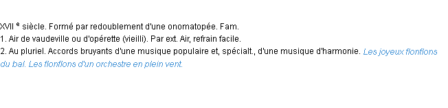 Signification développée en 1876 par Mr Littré (dictionnaire dit d’Emile Littré).Merci à Germain et Irène pour la numérisation du mot flonflon.