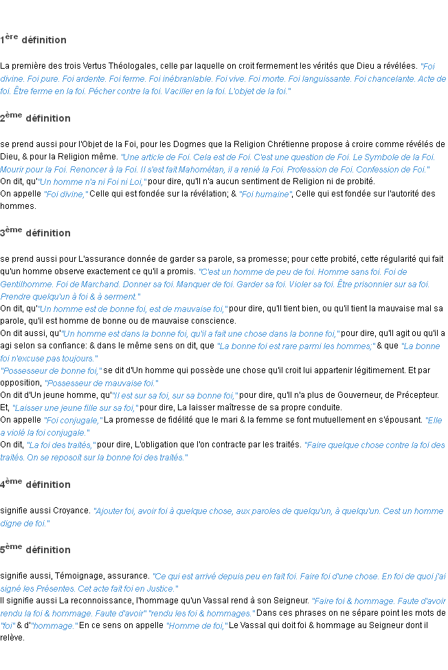 Ancienne définition « foi » du dictionnaire académique Français, parution de l’année 17962.Merci à Philippe et Luce pour la numérisation du mot foi.