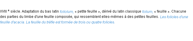Signification éditée en 2008 pour le terme « foliole » par l’équipe de wiktionary France.Merci à Yolande et Didier pour la numérisation du mot foliole.