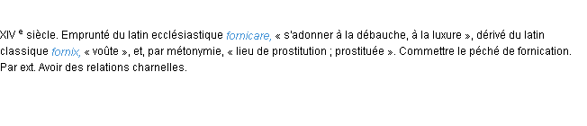 Définition développée dans dictionnaire d’Emile Littré (ancienne édition de 1876).Merci à Josée et Théodore pour la numérisation du mot forniquer.