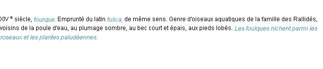 Signification du terme « foulque », parution de 1876 (dictionnaire le Littré).Merci à Joséphine et Aude pour la numérisation du mot foulque.